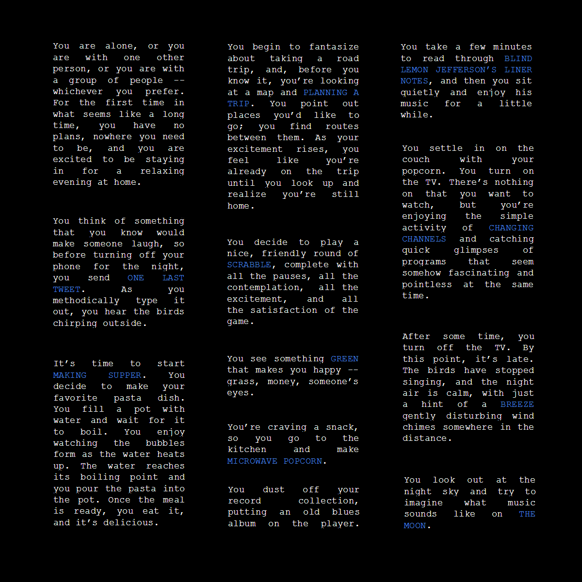There is creativity not just in the music but also in the underlying concepts that created the music. Each piece of this work has a predetermined element (be that melodic, rhythmic, motivic, or something else) that was decided on by something or some activity surrounding the average home. A boiling pot of pasta created the bass line for one piece; a game of Scrabble created the vibraphone melody to another piece. That being said, there are two different ways to think about this music. The first way is to think of it as a story describing a pleasant evening at home (hence Staying In), as explained in one version of the liner notes: