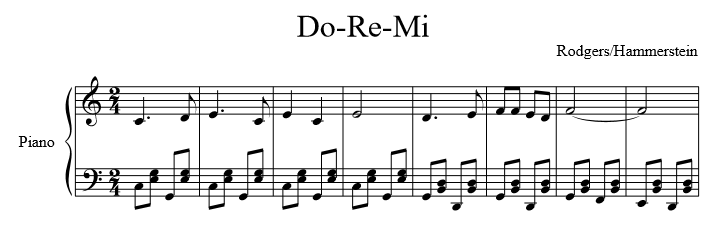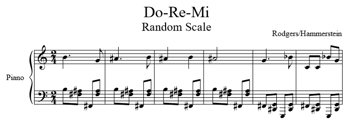 Before translating a composition of my own into this random scale, I translated a well known piece of music: “Do-Re-Mi” from The Sound of Music. I selected “Do-Re-Mi” because it’s recognizable and it uses every note of the major scale, plus a couple accidentals. Here are the first few measures of the song, in a simple piano arrangement: